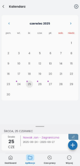 Kalendarz wyświetla listę nieobecności – dni zaznaczone kropką. Szczegóły wybranego dnia wyświetlają się poniżej.