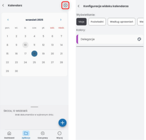Możesz skonfigurować wyświetlanie danych klikając przycisk u góry. Do wyboru jest parametr wg których są wyświetlane dni delegacji.