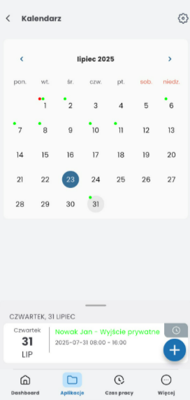 Kalendarz wyświetla listę urlopów oraz innych nieobecności. Dni z nieobecnością, są zaznaczone kropką, a szczegóły wybranego dnia wyświetlają się poniżej