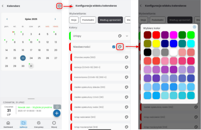 Możesz skonfigurować wyświetlanie danych klikając przycisk u góry. Do wyboru jest parametr wg których są wyświetlane dni wolne (moje, podwładni, wg uprawnień oraz wg struktury). Masz możliwość również przypisania kolory do danej nieobecności.