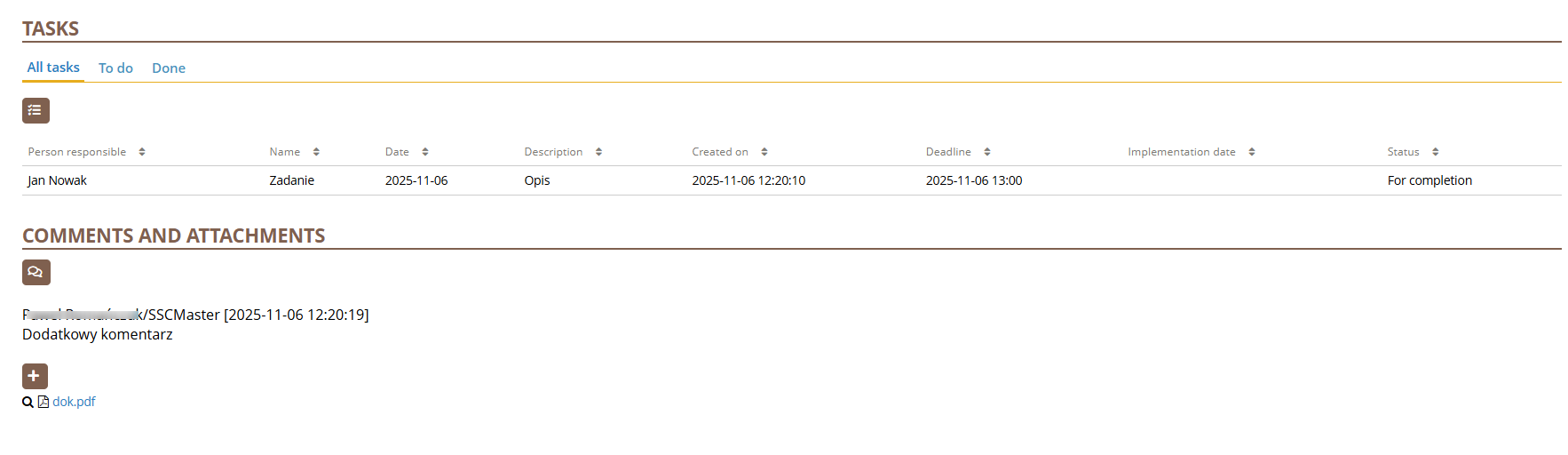 This tab provides space for assigning tasks, additional comments, and attachments.