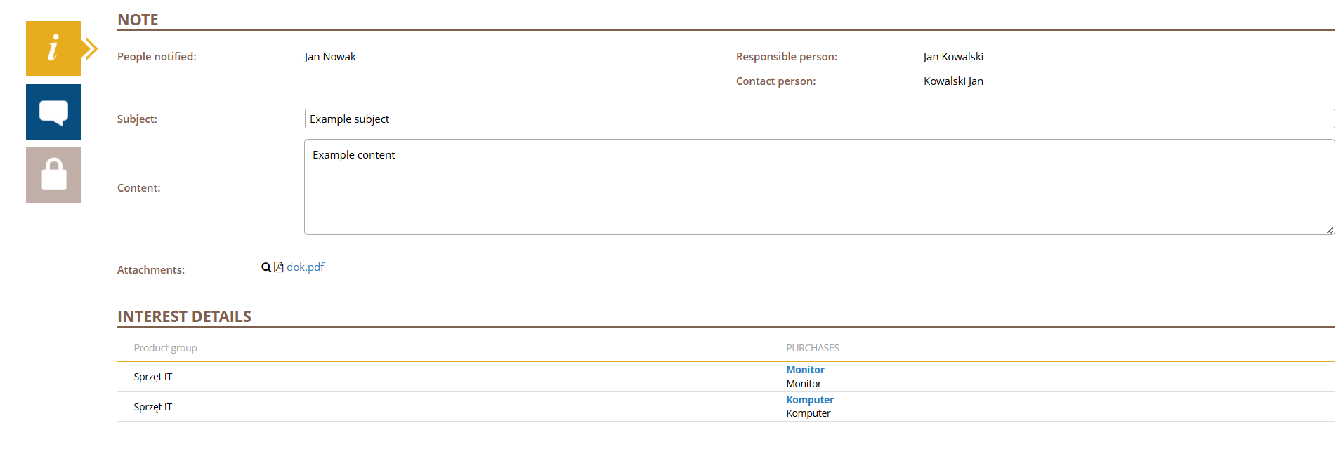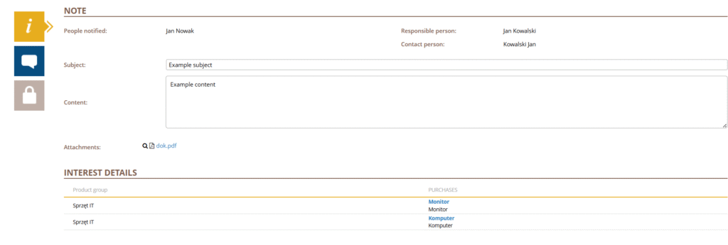 In the Note section, there is information such as Informed Persons, Responsible person, Contact Person, Content, and Subject, as well as a space for attachments.