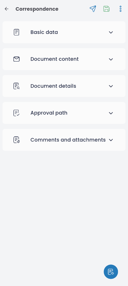 The correspondence document consists of the following tabs: Basic Data, Document Content, Document Details, Approval Path, Comments and Attachments.