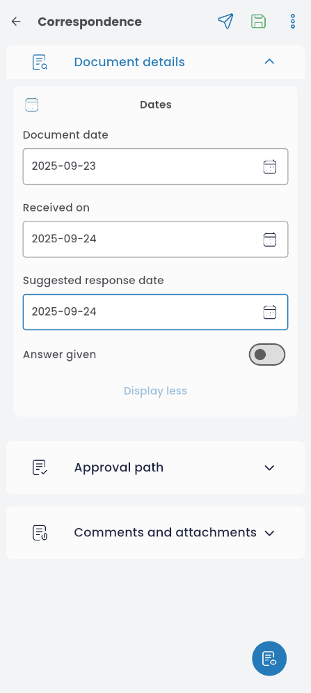 Document details include the document date, received/post date, and suggested response date — in the case of incoming correspondence.