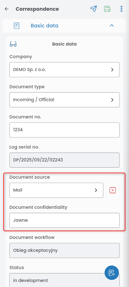 In the next step, a list of available types of correspondence will appear. You can select the appropriate one from the list or change the correspondence direction by displaying the second list (incoming <-> outgoing).
