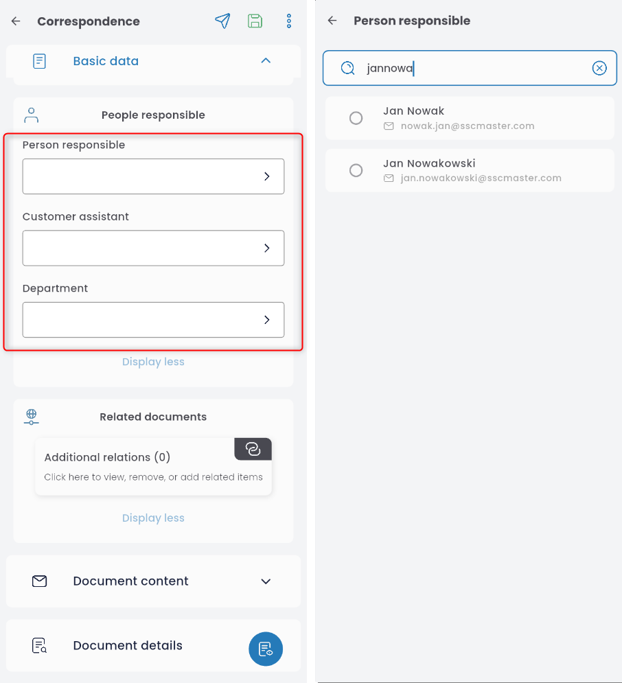You can enter the client assistant (or change it if one is added automatically), the responsible person, and the department.