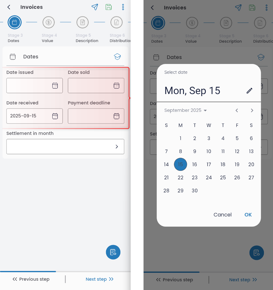 Enter the invoice number (from this tab, you can also change the invoice type and direction if needed).