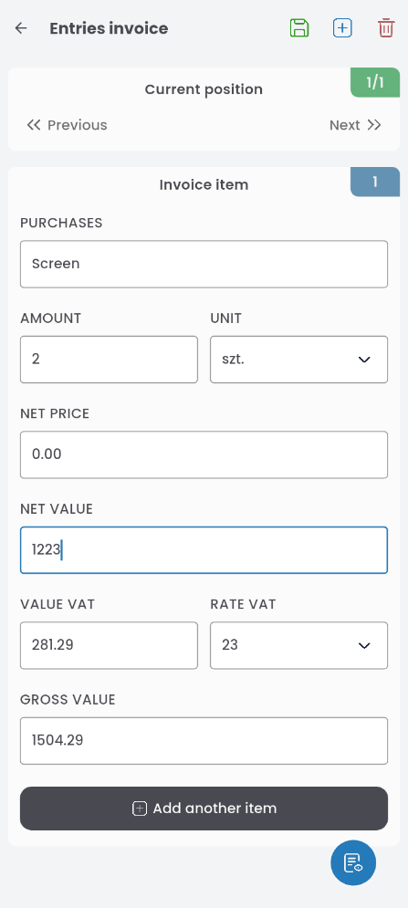 Switching to the VALUE tab will display the cost table. Fill in the PURCHASE ITEM field, enter the quantity, select the unit, enter the net price, and choose the VAT rate. The net and gross amounts will be calculated automatically.