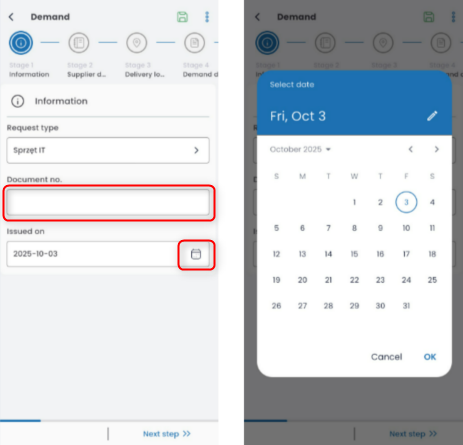 In the INFORMATION tab, enter the document number and choose the issue date of the document.