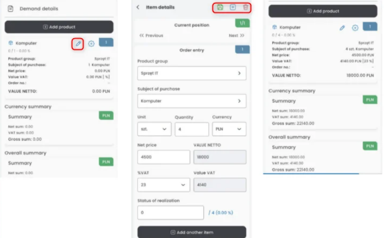 The selected items will appear on the list. To enter details for them, click the pencil icon. In the opened card, select the unit, enter the quantity, net price, and VAT. The completed card can be saved with the disk icon (or deleted with the trash icon). The filled cards will appear in the summary.