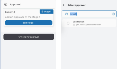 If the APPROVAL PATH tab is not filled in, click EDIT STAGE and select the decision maker. Once the document is ready, send it for approval by clicking the paper airplane icon.