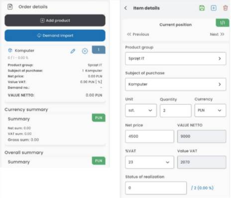 The added product will appear on the list. To enter details, click the pencil icon and enter the unit, quantity, net price, and VAT. You can add another item with the “+” icon, save with the disk icon, or delete with the trash icon.