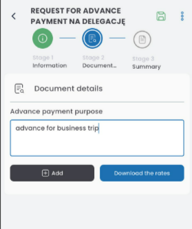 In the DETAILS tab, enter the purpose of the advance payment and click the ADD button.