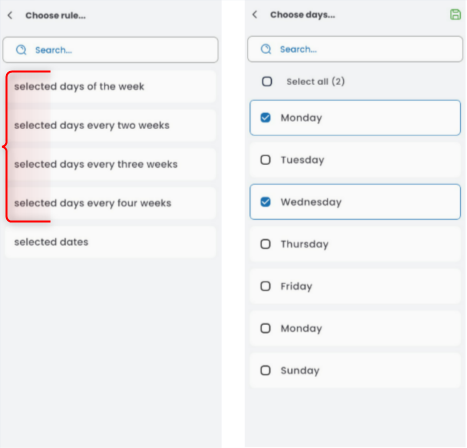 Choose whether you’re interested in regularly recurring weekdays (e.g., every week, every second, third, or fourth week) and specify which days apply (save using the disk icon),