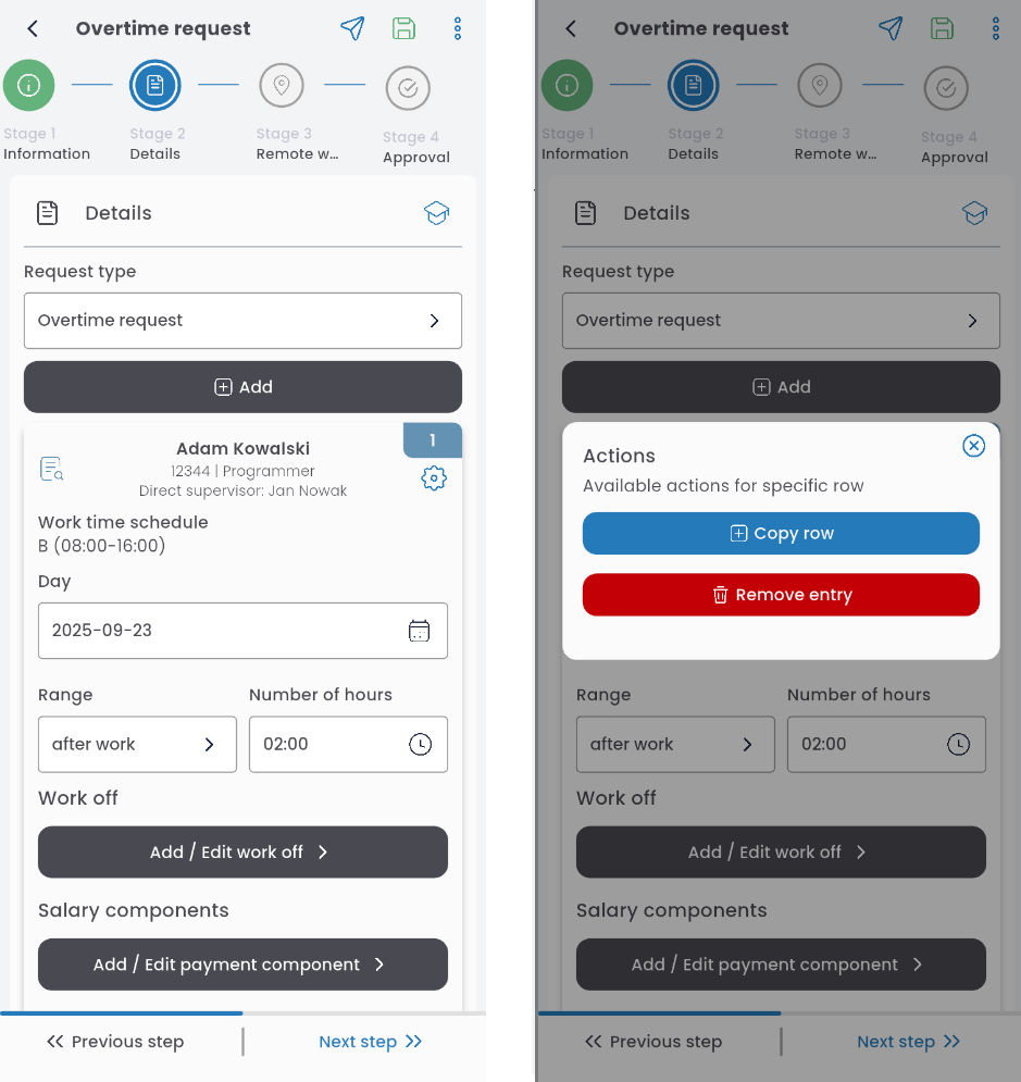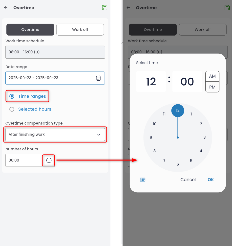 If you want the overtime to be attached to your scheduled working hours, select the TIME RANGES option. Indicate whether the overtime should be performed before or after regular working hours, and specify the number of hours.