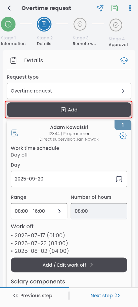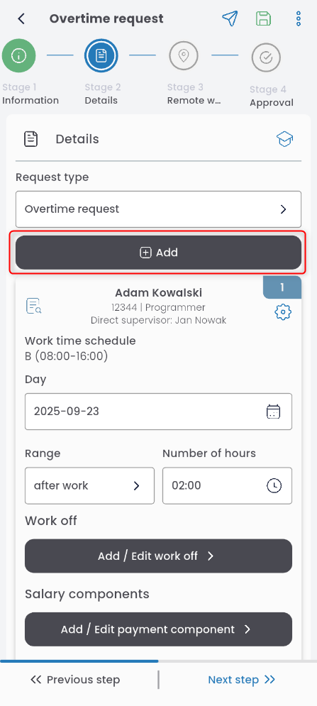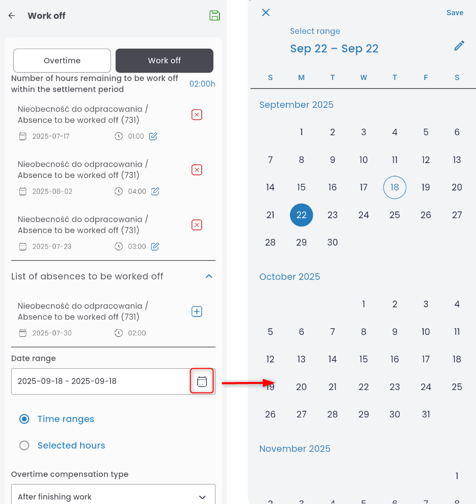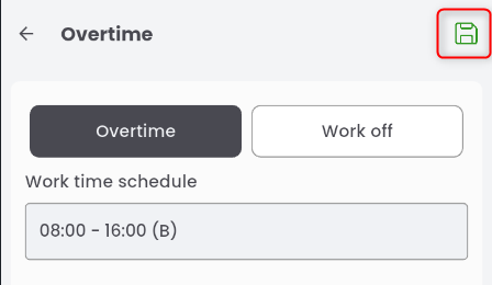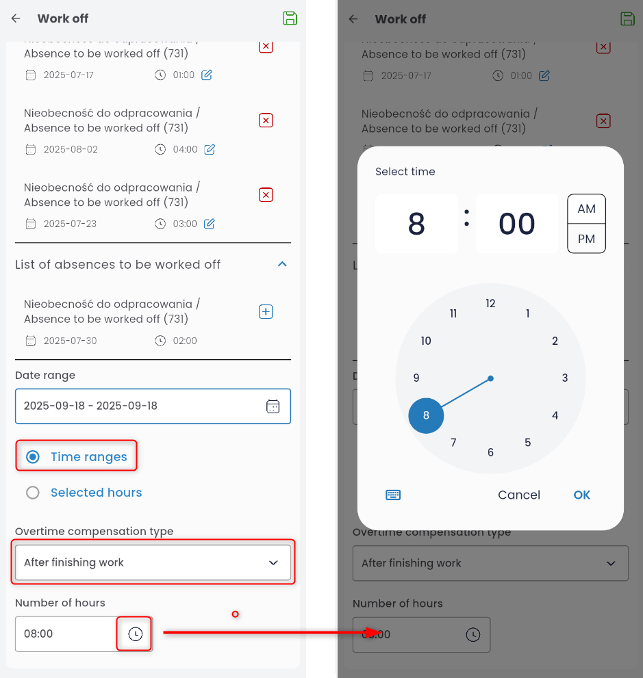 If you want to mark overtime as make-up time (compensating for previous underwork), click ADD / EDIT WORK OFF, select the absence to be made up for, and save using the disk icon.