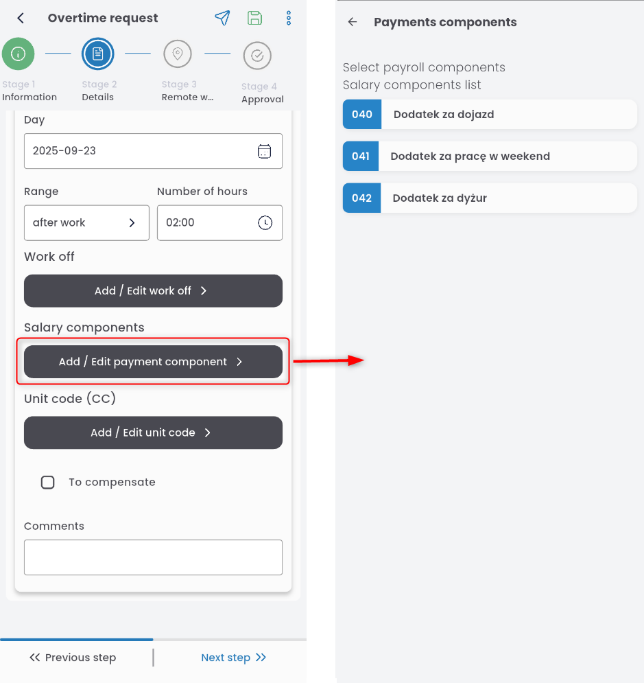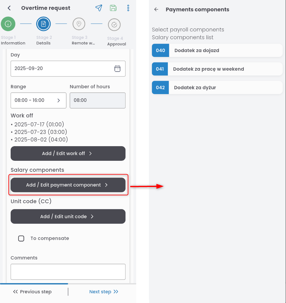 To add a payroll component to the overtime, click ADD / EDIT PAYMENT COMPONENT, select the component from the list, and save.