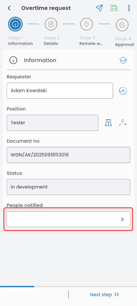 In the INFORMATION tab, you can enter a person to be notified. Click the PEOPLE NOTIFIED field and select individuals from the list.