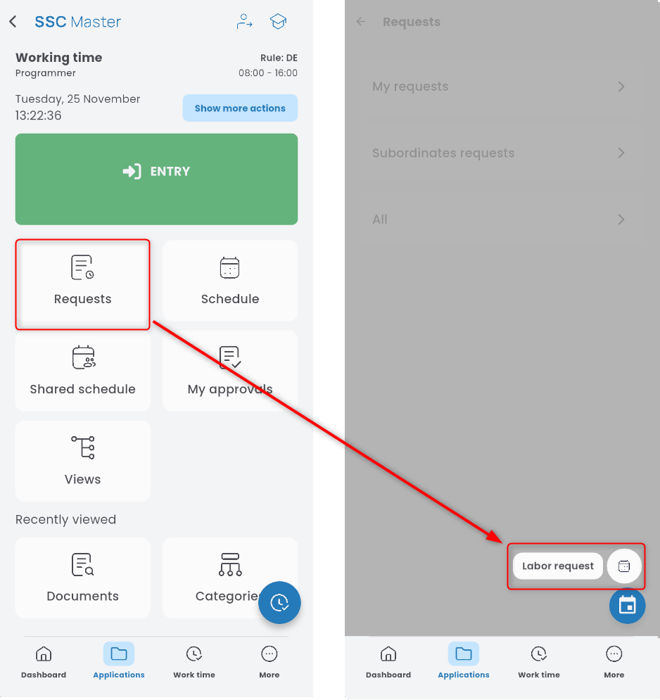 To create an overtime request, go to the LABOR application, click the “+” button, and select LABOR REQUEST.