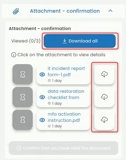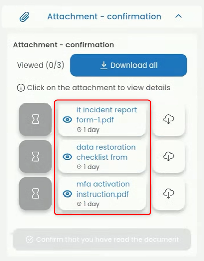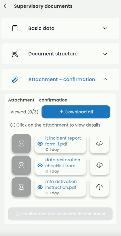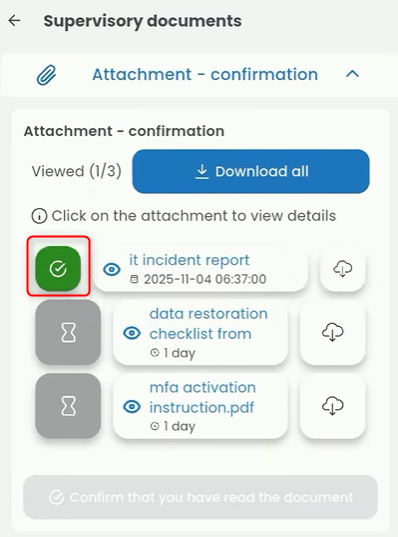 To review the attachments, go back to the ATTACHMENTS – REVIEW tab. A grey icon with an hourglass means that the given attachment is awaiting your review.