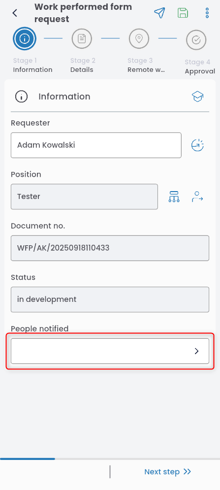 In the INFORMATION tab, you can specify a notified person. Click the field and select someone from the list.