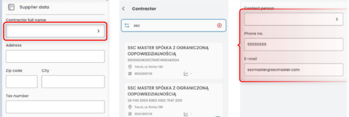 In the SUPPLIER DATA tab, enter the supplier’s details for the requisition. You can either manually enter the data or import it from the contractors’ list. Additionally, you can select a contact person, and enter the phone number and email address.