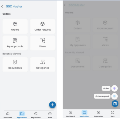 To create a purchase order, open the ORDERS application, press the “+” button, and select Order.
