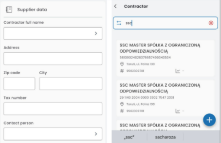 In the SUPPLIER DATA tab, enter the contractor’s details or import them. Click on FULL CONTRACTOR NAME and search for it in the database. The data will be filled in automatically. Enter the contact person, phone number, and email address.