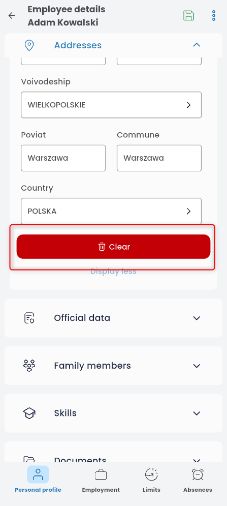 You can enter an address manually by typing data into each field, or you can use sync with another address. To do this, click SYNCHRONIZE DATA WITH ANOTHER ADDRESS and select the correct address from the list. Note: When synchronization is enabled, this means that if you make changes to the base address, the address will also change in the remote one where you used this option.