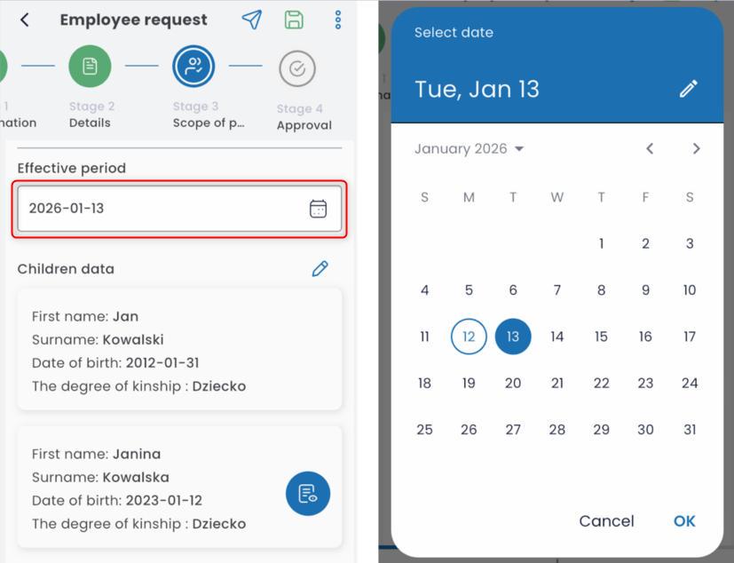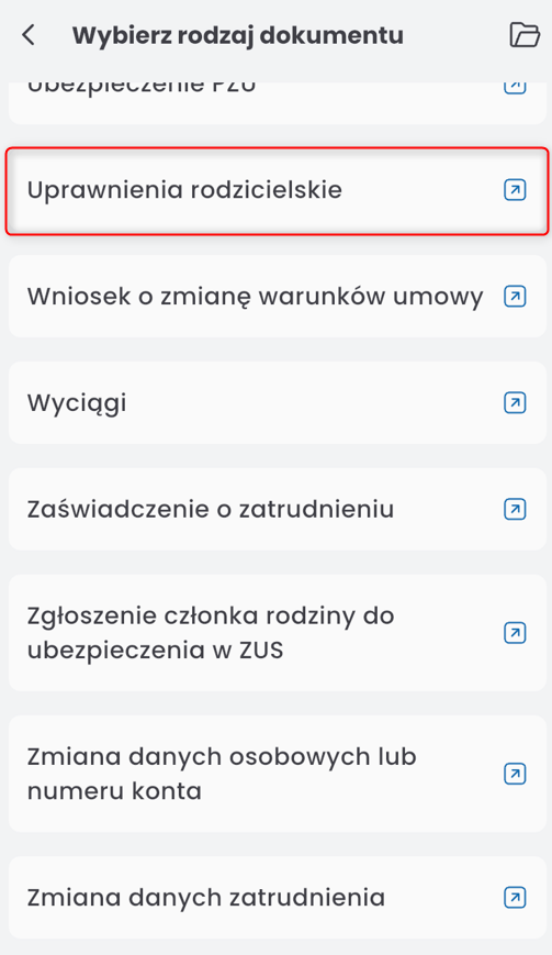 The PARENTAL RIGHTS request is a special type of application. It is used to report and settle employee entitlements related to childcare, in accordance with the Labour Code.
