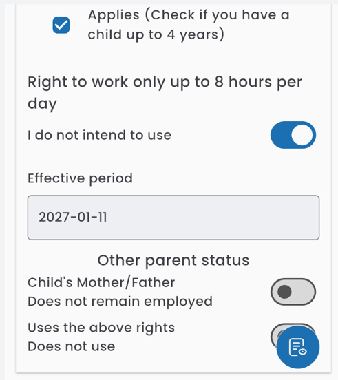 Through this request, the employee informs the employer that they are exercising specific rights as a parent/guardian. Based on this information, the system and HR department know which rights apply to you (e.g., days off, protection from overtime).