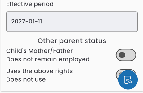Below, the start date of the request’s validity is displayed, along with toggles for indicating information about the second parent (whether they intend to use the entitlements and their employment status).