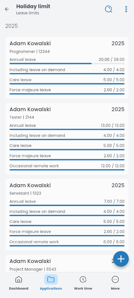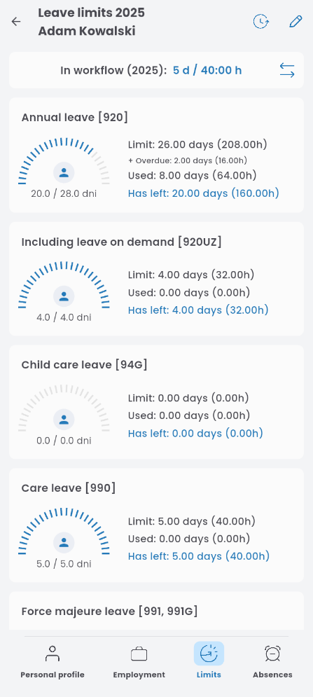 To view the details, click the selected document. It contains information about leave days pending approval, the number of days assigned to each limit (including entitled, unused, and used days).