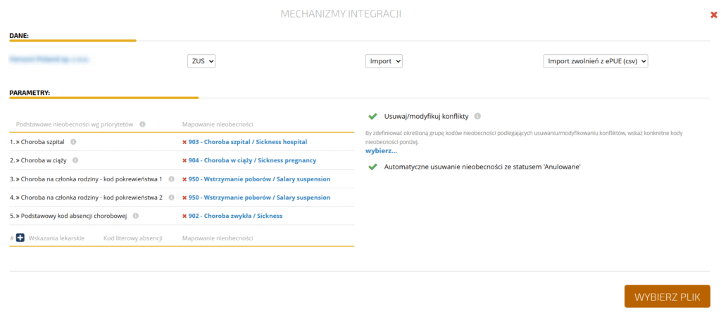 W sekcji parametry wyświetlane są domyślne rodzaje nieobecności powiązane z konkretnymi kodami nieobecności. Dodatkowo istnieje możliwość wskazania innego rodzaju absencji w zależności od wskazania lekarskiego oraz kodu literowego choroby, który ma pierwszeństwo podczas importu przed domyślnym (głównym) kodem absencji.